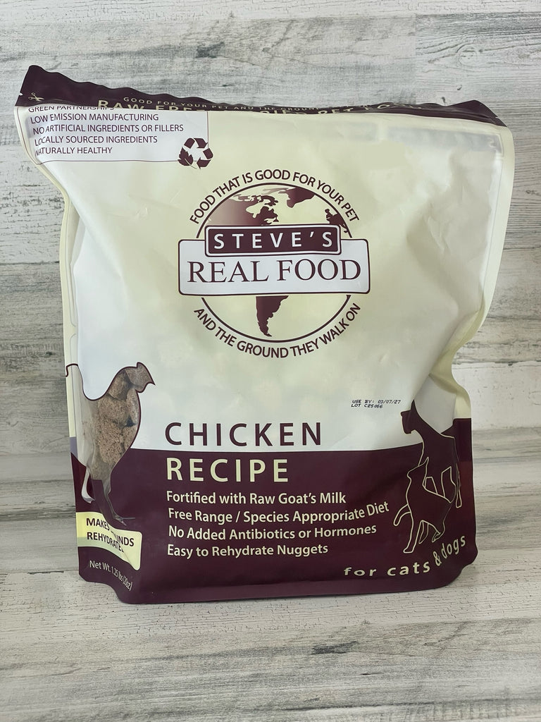 Steve’s free range, vegetarian fed Chicken is high in the trace mineral selenium, which acts as an antioxidant to fight free radicals and is believed to help with arthritis, the cardiovascular system, and allergies. The raw meat chicken diet has a mid range fat content and a high level of protein, making it a good option for high-energy dogs.
